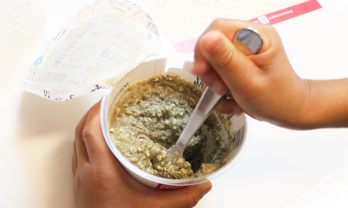 - カップを開けてみます。ハーブのような、なにやら香ばしくいい匂いがします。粉がパッと出てくるので気を付けてください。