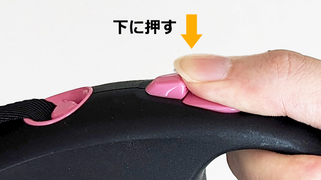 - ブレーキボタンを押し、ロックボタンを奥に押し込むとリードの長さが固定されます。