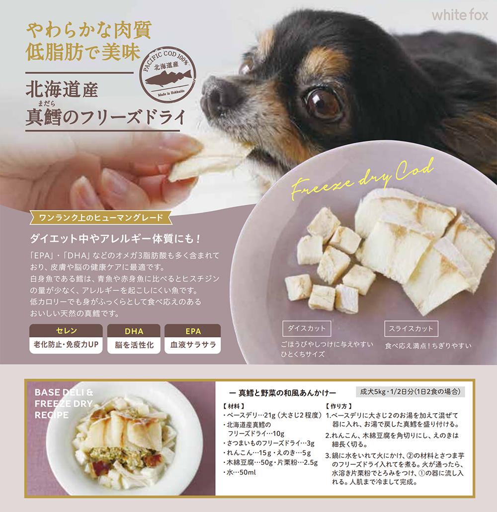 ●お湯で戻すと生魚をボイルしたような香りと食感が楽しめ、ペットの食欲が増進します。