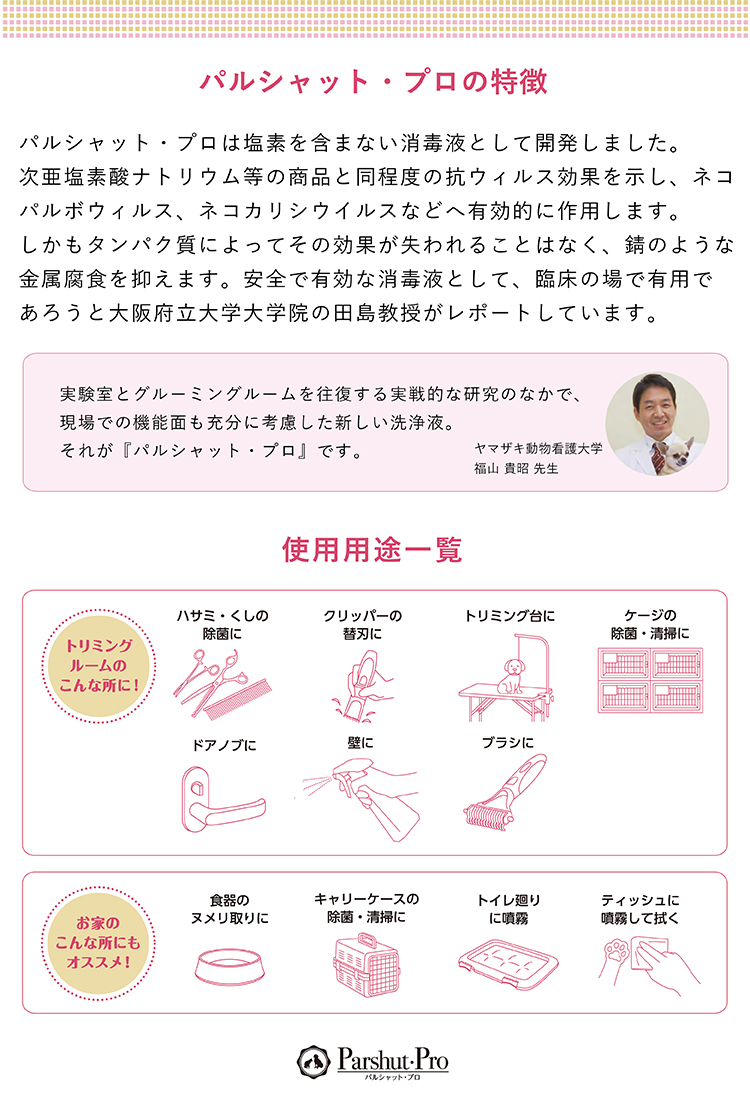 実験室とグルーミングルームを往復する実戦的な 研究のなかで、現場での機能面も充分に考慮した 新しい洗浄液。それが『パルシャット・プロ』です。