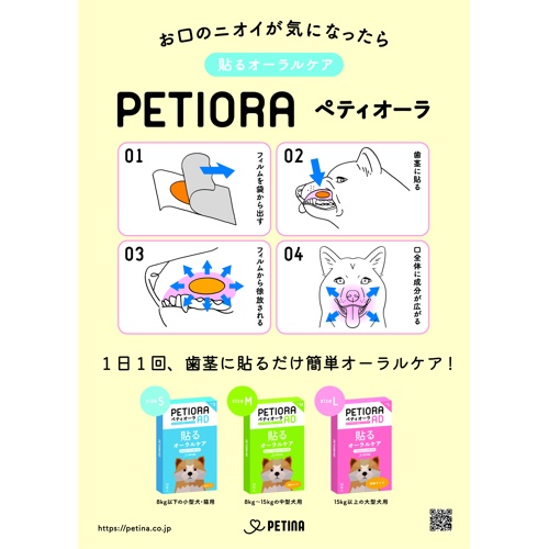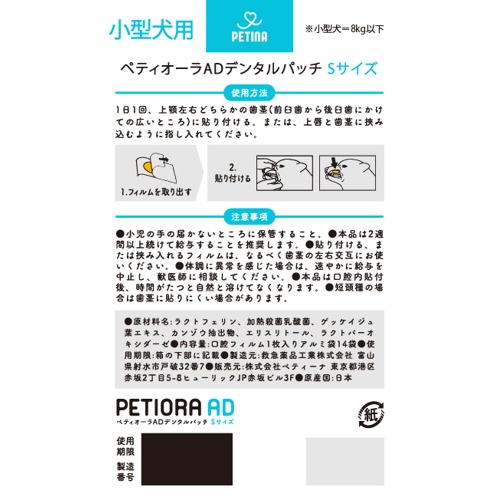 - ・成分が長く留まり、貼るだけでお口の健康をサポート! ・噛む力や歯が弱いワンちゃん、ネコちゃんにも安心! ・お口の中で溶けてなくなるフィルム・シート! ・人用に使われている成分を使用し人用医薬品の製造工場で生産 ペティオーラの5つの特長 ①5つのオーラルケア成分 ・ラクトフェリン+ラクトパーオキシダーゼ ・クリスタパス乳酸菌Ⓡ(KT-11) ・甘草抽出物 ・エリスリトール ・ゲッケイジュ葉抽出物 ②成分を口腔内にとどめて効果を発揮する ・成分が15分~30分間口腔内にとどまる徐放式 ・より少ない成分で効果を発揮 ・成分の効果+免疫力向上による口内環境の改善 ③貼るだけ簡単 ・貼るだけ、短時間でオーラルケアができる ・手や家具などが汚れない ・個包装 ④安全・安心 ・溶けてなくなる ・歯折・誤飲のリスクがない ・動物実験で効果と安全性を確認 ⑤高品質で新しいタイプ ・人用医薬品の品質・安全基準で製造 ・動物用の剤形としては初の新剤形